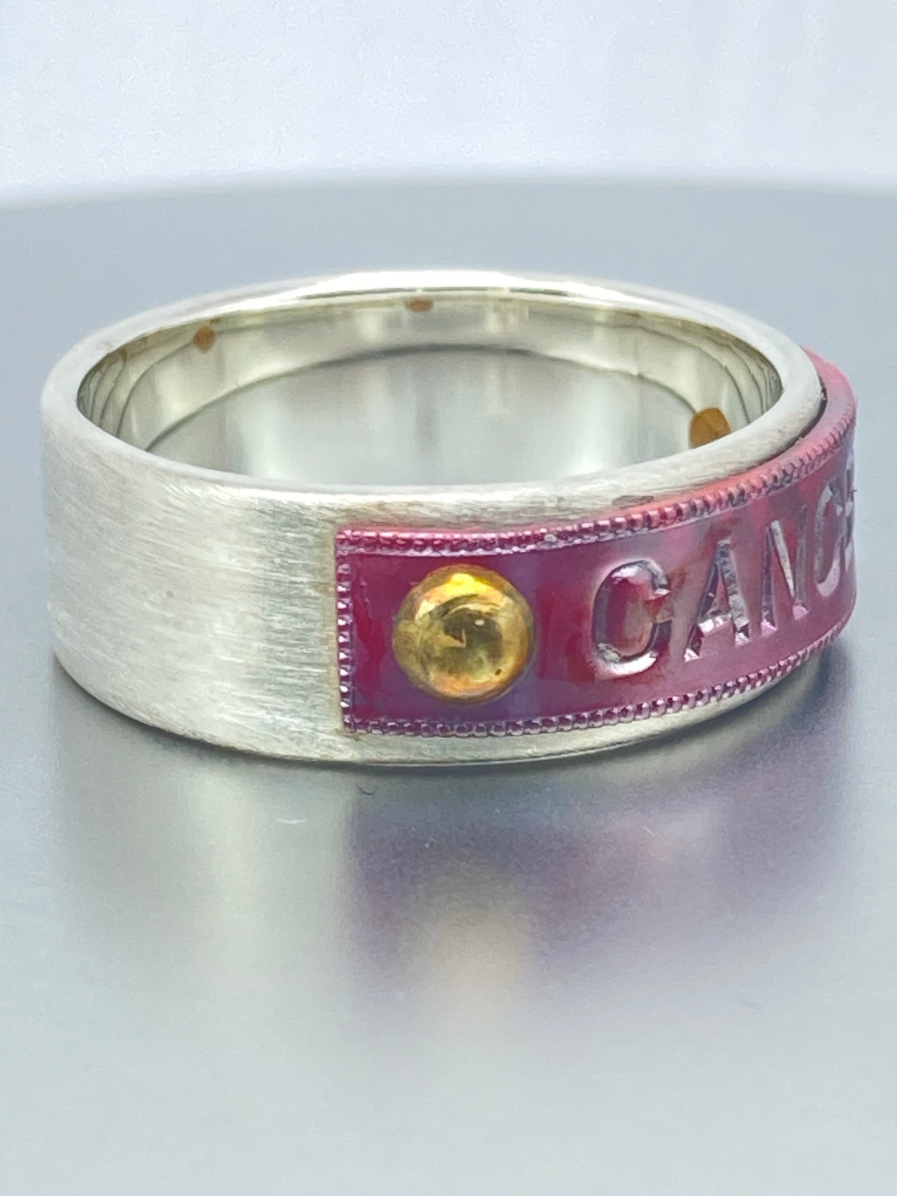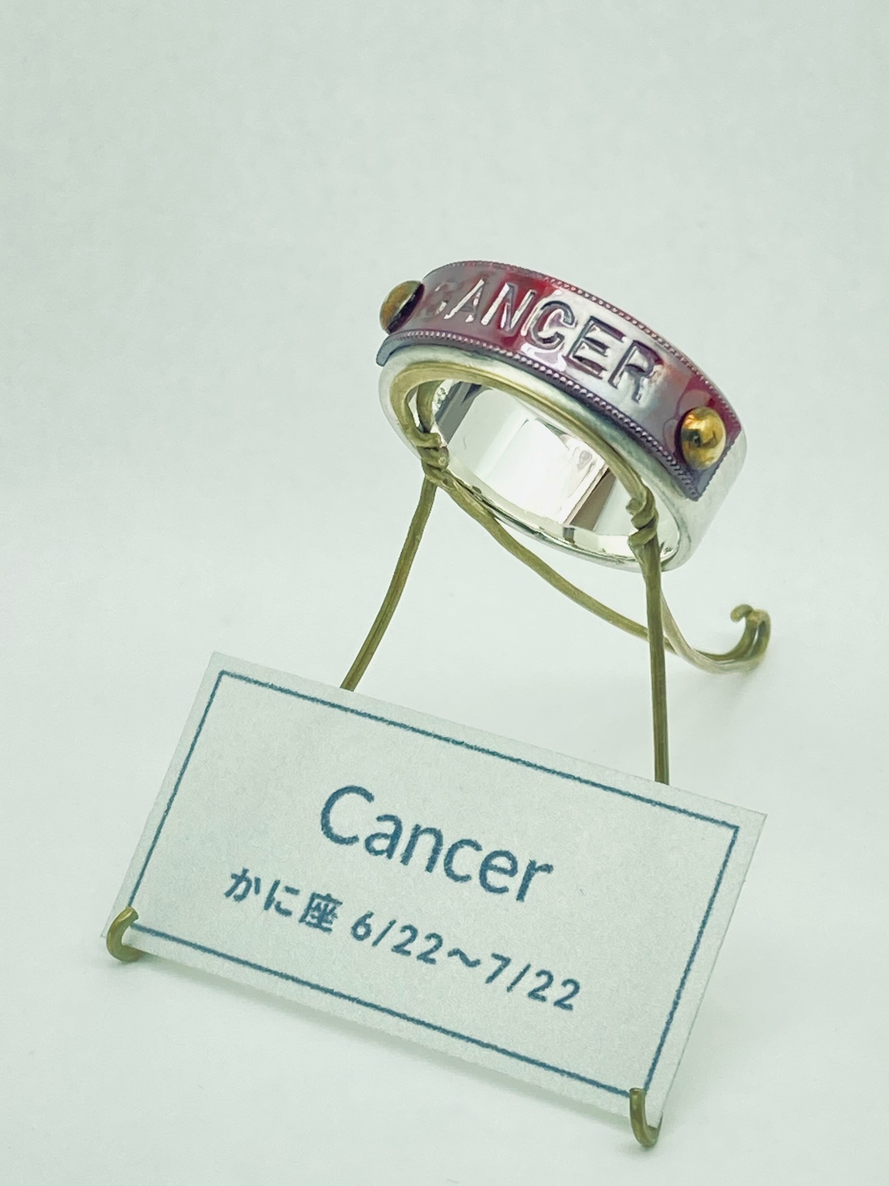 緋銅プレートにフランス語の星座刻印を打ち、リベット留めをしたシルバー製リングです。