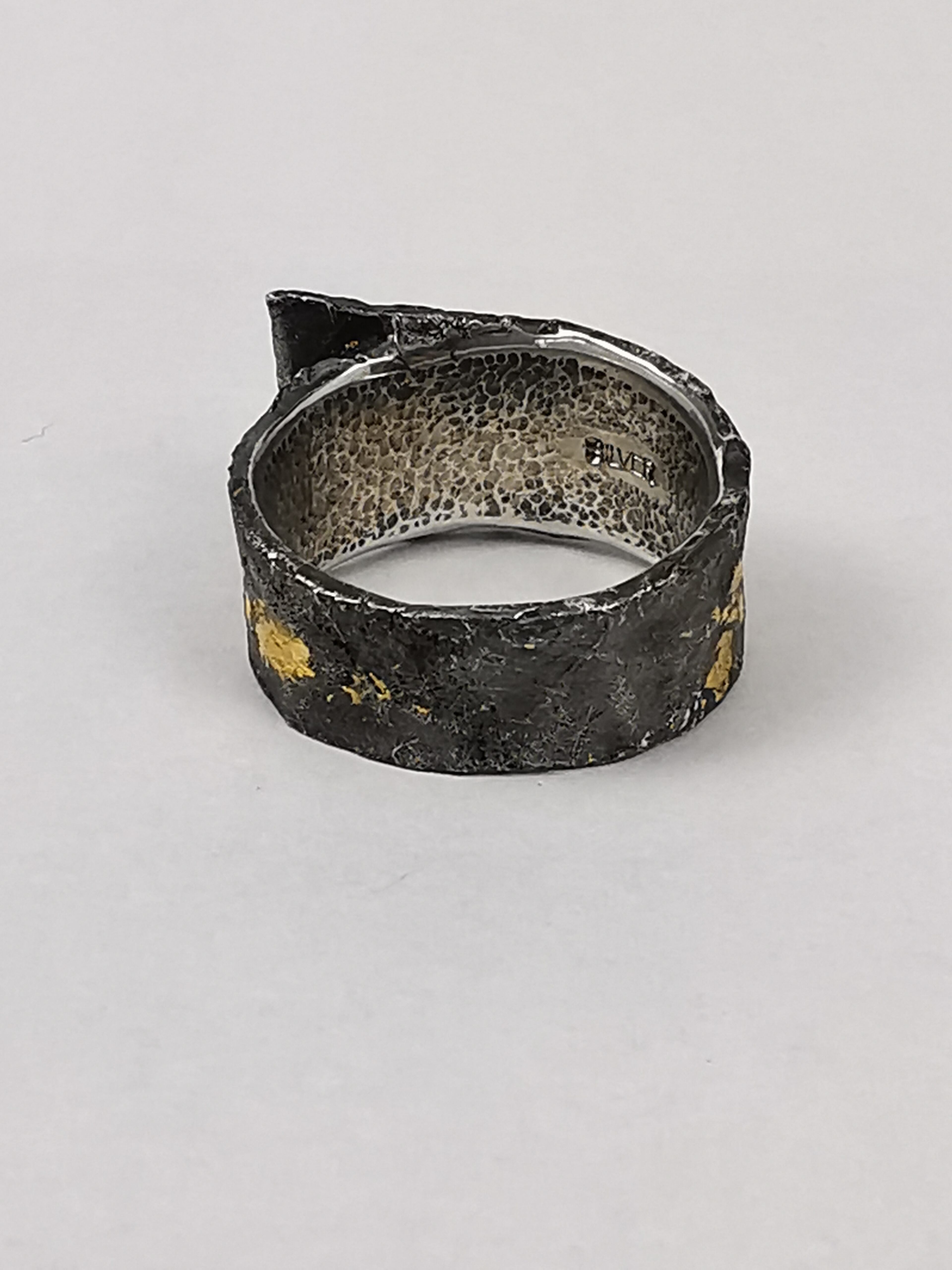 手漉き和紙の質感をそのまま表現したシルバー 925製リングです。黒くいぶした表面に金箔を貼っています。